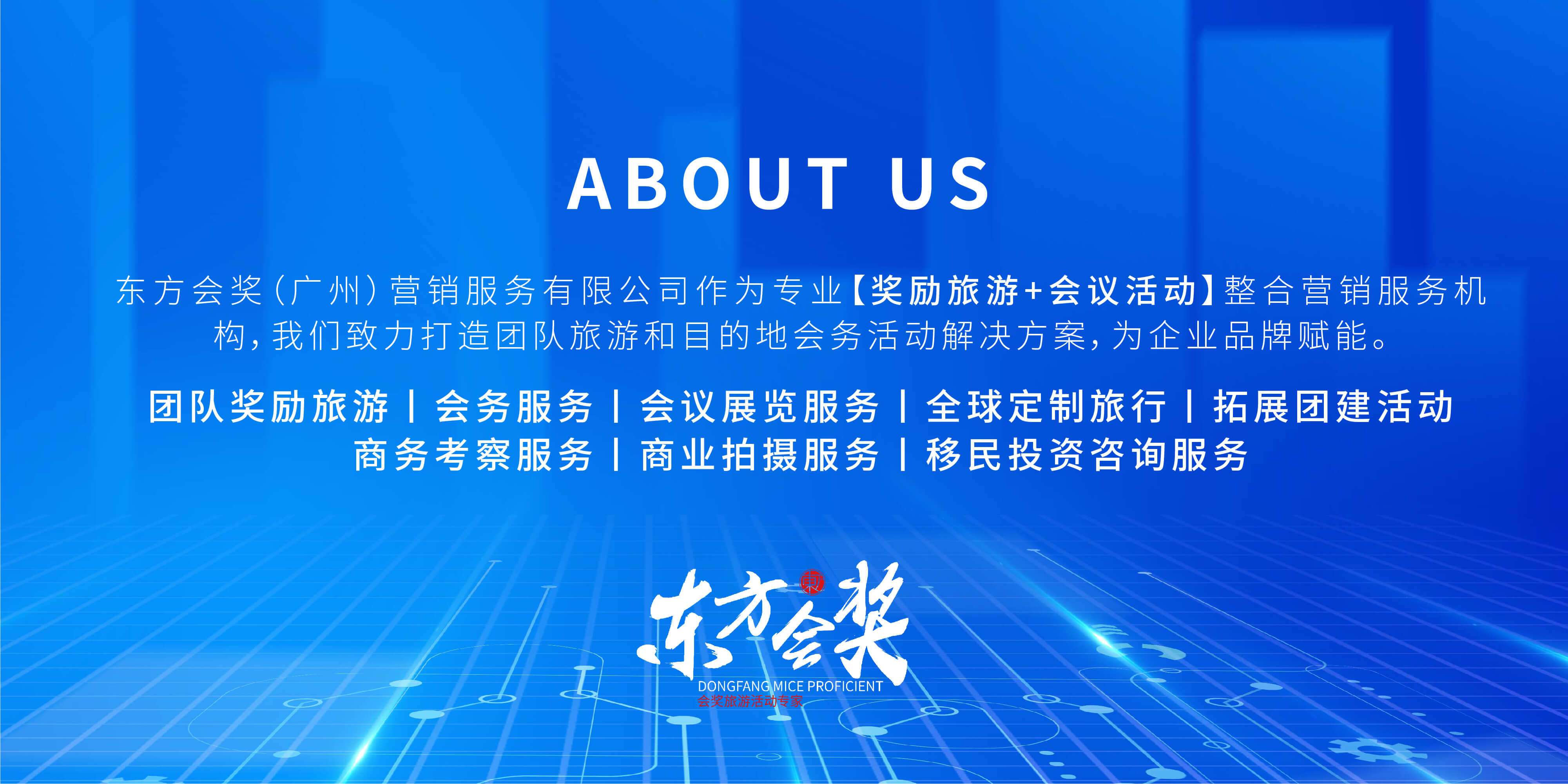 東方會獎(廣州)營銷服務有限公司 作為專業(yè)會獎旅游活動專家,我們致力打造專業(yè)團隊旅游和目的地會務會展解決方案,為企業(yè)品牌賦能。 基于對商業(yè)客戶需求的深刻理解和豐富的服務經驗,東方會獎成功實現從單一服務到整合服務、從簡單服務到高附加值服務、從線下服務到覆蓋線上線下的整合營銷服務布局,旗下東方會獎、途蘭朵旅行、左契文化、途蘭朵科技、全球開拓者等各業(yè)態(tài)的專業(yè)子公司相繼成立。目前,東方會獎已經在中國主要經濟區(qū)域建立了完善的服務網絡,覆蓋廣州、深圳、佛山、杭州、成都、貴陽、西安、福州、廈門、桂林、長沙等核心城市。 成立至今,東方會獎一直專注于為新零售、保險、金融、直銷等機構客戶提供“一站式”整合營銷服務,業(yè)務涵蓋:團隊獎勵旅游,目的地會務服務,會議展覽服務,全球定制旅行,拓展團建活動,商務考察服務,專業(yè)旅行拍攝服務。為企業(yè)品牌實現真正的全案整合營銷。